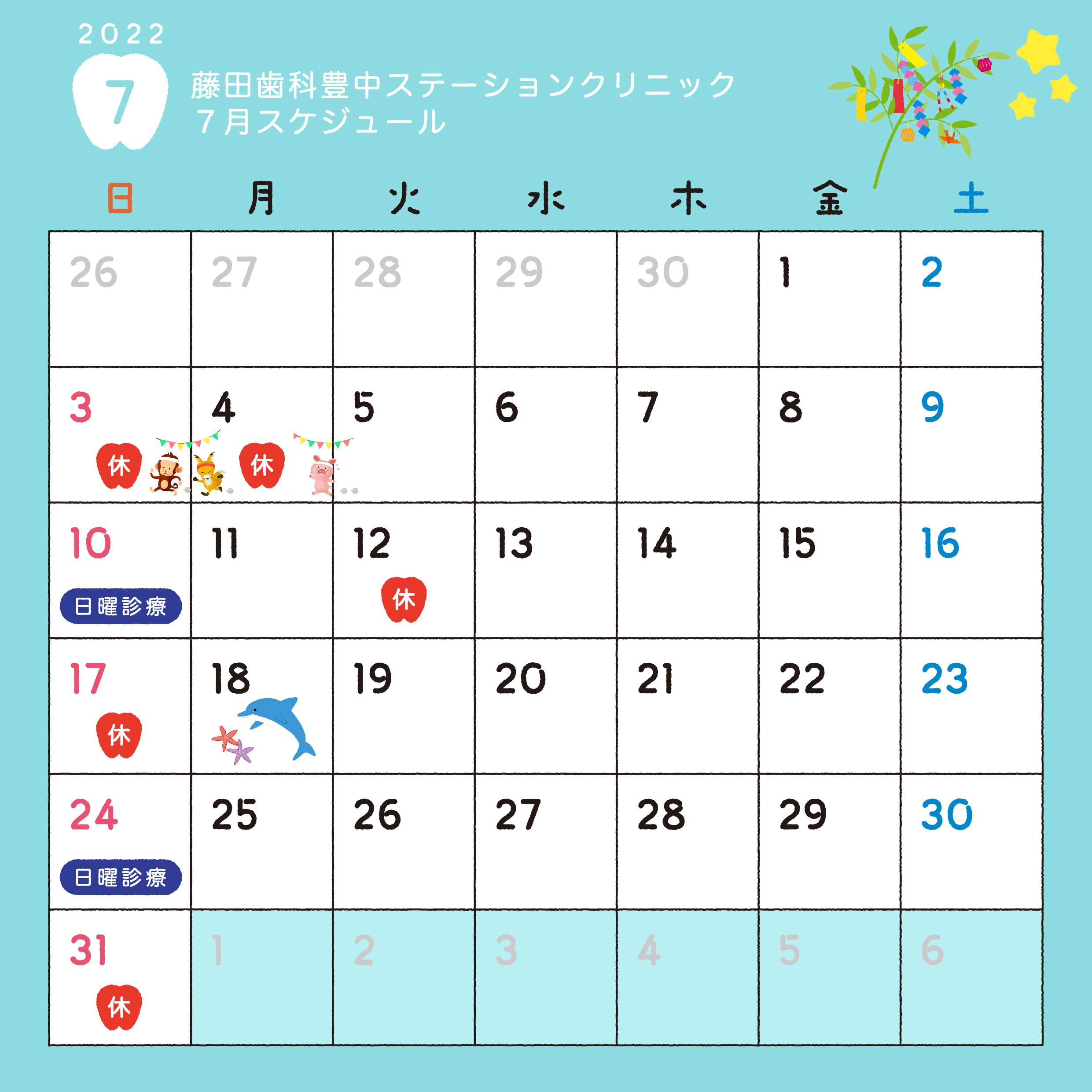 藤田歯科豊中ステーションクリニック様_医院の診療日カレンタ゛ー7月_アートホ゛ート゛ 1